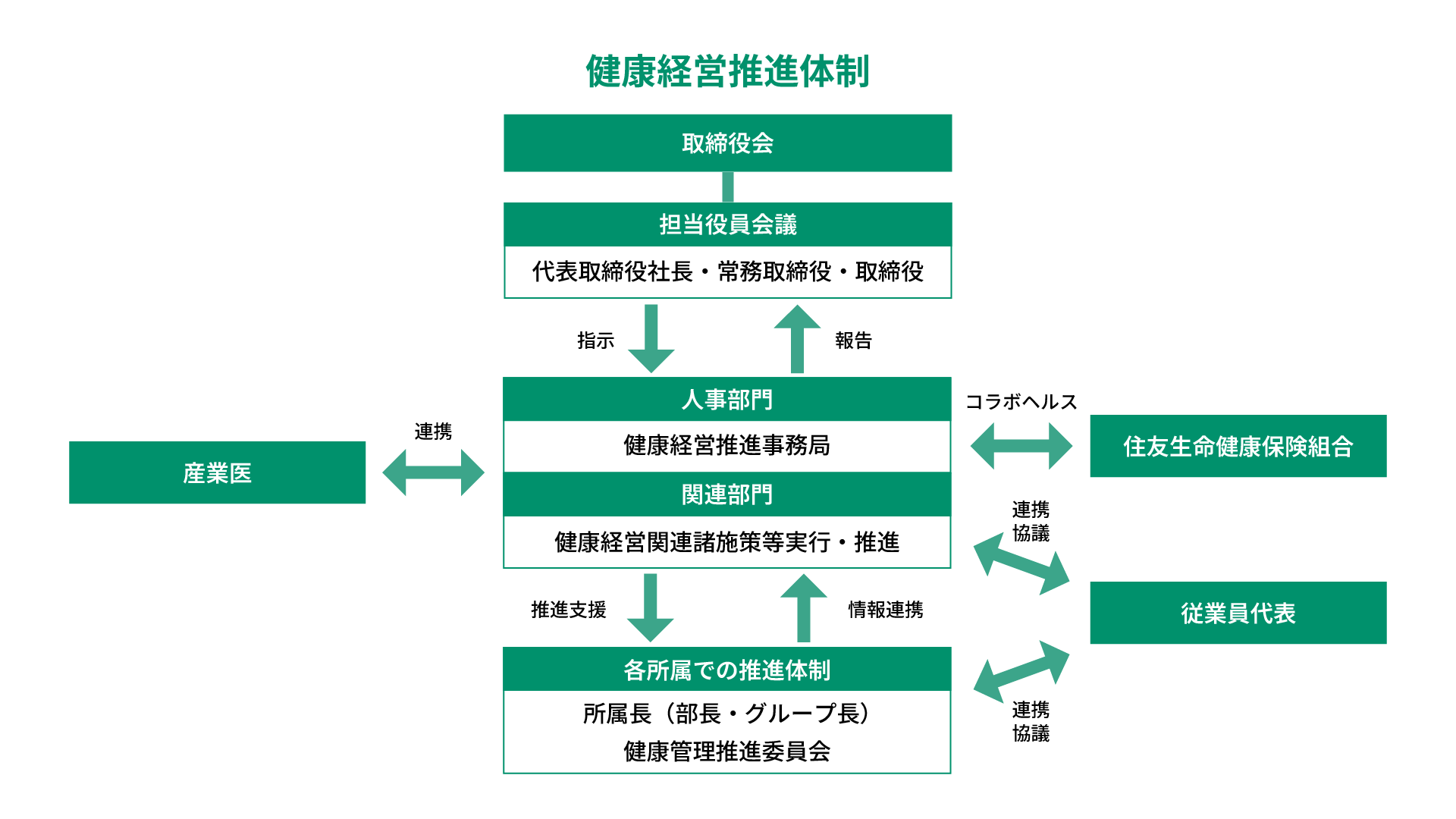 「健康経営」の運営については、人事部門に事務局を置き各部門と連携を図っています。また、各年度の取組み結果および次年度の取組みについては担当役員会議で確認しPDCAサイクルを回すとともに、取締役会に報告する体制としています。